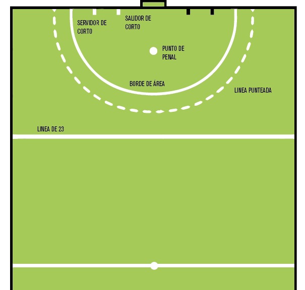 El área contenida por los dos cuartos de círculos incluidos y las líneas uniéndolos en cada final del campo y frente al centro de las líneas de fondo.